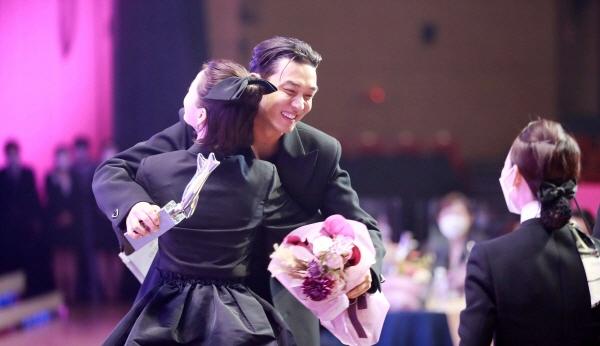 30회를 맞은 2021 부일영화상 시상식이 7일 오후 부산 해운대구 벡스코 오디토리움에서 열렸다. 남우주연상을 차지한 배우 유아인이 수상자로 나선 정유미의 축하를 받고 있다. 김경현 기자 view@2021 부일영화상 최다 수상작은 영화 ‘모가디슈’ 였다. 코로나19 상황에도 358만 명의 관객을 동원한 ‘모가디슈’는 5관왕으로 올해 부일영화상에서 가장 빛난 영화가 됐다. ‘모가디슈’는 내년 제94회 미국 아카데미영화상 국제장편영화 부문 한국영화 출품작으로도 선정됐다.