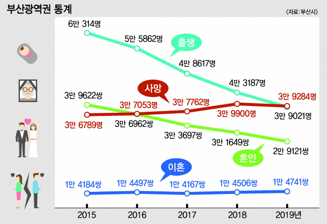 2019년 출생아 숫자는 3만 9021명으로 불과 4년 전인 2015년에 비해 35.3%나 줄어들었다. 혼인신고를 한 부부 숫자 역시 2019년 2만 9121쌍으로 4년 전과 비교해 26.5% 감소했다. 반면 매년 증가세인 사망 수는 2019년 3만 9284명으로, 출생아 숫자를 넘어서는 지경에 이르렀다.