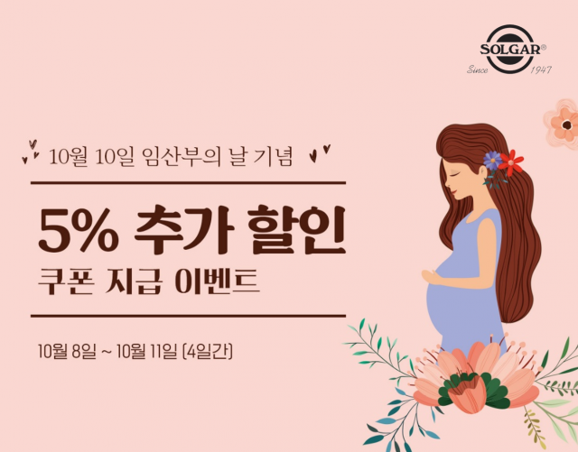 △프리미엄 비타민 전문기업 한국솔가가 10일 임산부의 날을 맞아 임산부를 위한 영양제 할인 이벤트를 진행한다. 대상 제품은 △엽산 400 △엽산 800 △철분 25 △비타민 B12 △비타민 D3 1000IU △프리네이탈 종합비타민 등 7종으로, 기존 할인가에서 5% 추가 할인된 가격으로 구매할 수 있다. 제품별 상세 페이지에서 쿠폰을 다운받아 구매 시, 사용하면 된다. 이벤트는 오는 11일까지 솔가몰에서 진행된다. 솔가 엽산 400·800은 혈액 내 호모시스테인 수준 정상 유지·세포와 혈액 생성·태아 신경관 정상 발달 등에 도움을 줄 수 있어 필수 섭취 영양제로 꼽힌다. 코셔 파르브(육류나 유제품 성분을 전혀 함유하지 않은 식품) 인증을 받아 채식주의자도 섭취 가능한 것이 특징이다.