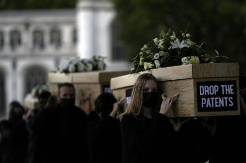 12일(현지시간) 영국 런던에서 시위대가 전 세계 코로나19 사망자를 상징하는 모형 관을 든 채 행진을 하고 있다. 이들은 가난한 나라들이 백신 접종을 할 수 있도록 대형 제약회사들이 코로나19 백신 특허권을 포기할 것을 촉구했다. AP연합뉴스