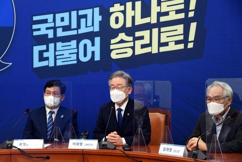 더불어민주당 이재명(가운데) 대통령 후보가 13일 국회에서 열린 ‘대통령 후보-당 대표-상임고문단 간담회’에 참여해 발언하고 있다. 김종호 기자더불어민주당 이재명 대선후보가 13일 당 상임고문단과 오찬을 겸한 상견례를 갖는 등 대선후보로서 공식 행보를 시작했다. 이날 당무위원회의 결정과 이낙연 대표의 승복 선언으로 ‘불복’ 논란에 대한 부담은 덜었지만, ‘대장동 의혹’에 대한 수사가 가파르게 진행되면서 여전히 당내 불안감은 가시지 않는 분위기다.