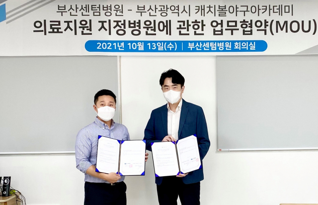 센텀의료재단(이사장 박종호)은 13일 부산센텀병원 7층 회의실에서 부산광역시 캐치볼야구아카데미(대표 이재곤·왼쪽)와 의료지원 지정병원에 관한 업무협약을 체결했다.