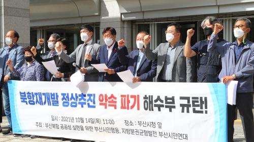 부산북항 공공성 실현을 위한 부산시민행동 등 지역 시민단체 회원들이 14일 오전 부산시청 광장에서 ‘북항재개발 정상추진 약속 파기 해수부 규탄 기자회견’을 하고 있다. 정종회 기자 jjh@부산 경제계와 시민사회가 최근 해양수산부가 발표한 북항1단계 사업 변경안에 대해 ‘북항재개발 사업 취지를 외면한 것은 물론 부산의 미래와 맞닿아 있는 두 개 국가 사업마저도 좌초시킬 우려를 낳고 있다’고 거세게 반발하고 나섰다. 문성혁 해수부 장관을 향해서도 “직접 언론을 통해 (북항재개발 1단계 기반시설 준공을)문재인 대통령 임기 내 마무리하겠다고 약속해 놓고 스스로 사업계획을 뒤집어 행정 신뢰를 무너뜨렸다”고 비난했다.
