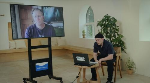 크레이그 포스터 감독과 방송인 타일러 라쉬가 영상 인터뷰를 하고 있다. WOF 사무국 제공“지구로부터 얼마나 많은 것을 얻을 수 있을까 고민하지 마세요. 대신 지구를 얼마나 잘 지킬 수 있을지를 고민해 주세요. 자연은 그런 마음으로 늘 우리를 보살폈고 가르쳤습니다.”