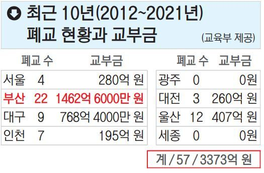 해당 기간에 전국의 8개 특별·광역시 중 규모가 작다는 이유로 가장 많이 폐교된 곳이 부산이다. 22개 학교가 사라져 특별·광역시 전체 폐교의 38.6%에 이른다. 작은학교를 없앤 대가로 부산시교육청이 받은 인센티브 성격의 교부금은 1462억 6000만 원이다. 이 또한 8개 특별·광역시 중 압도적으로 많다.
