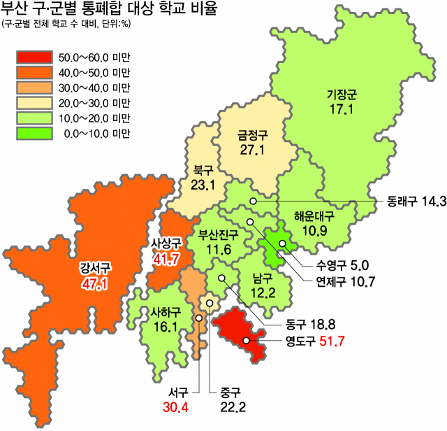부산에서 좌성초등처럼 잠재적으로 통폐합 대상인 작은학교(초등 240명 이하·중등 300명 이하)는 모두 130곳으로 부산의 전체 초·중·고 617개교 중 21.1%에 이른다. 16개 구·군별 전체 학교 수 대비 작은학교 비율이 가장 높은 곳은 영도구로 무려 절반 이상(51.7%)이 소규모 학교다. 이어 강서구(47.1%), 사상구(41.7%), 서구(30.4%), 금정구(27.1%) 순으로 작은학교 비율이 높다. 부산에서 고령화가 급속히 진행 중인 원도심과 서부산권의 농촌·공단 지역에 이들 학교가 집중돼 있다.