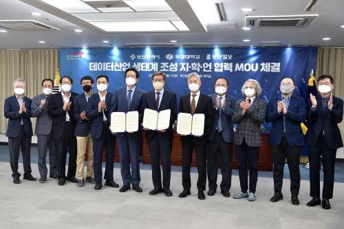 부산시와 부경대, 부산일보는 18일 오후 부산시청에서 ‘데이터산업 생태계 조성 지·학·언 협력 시범사업 추진을 위한 업무협약(MOU)’을 체결했다.