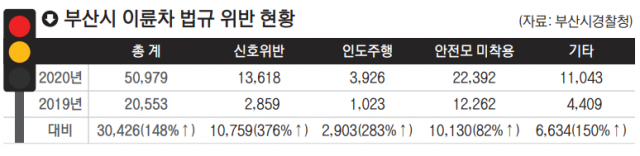 비대면 문화의 확산으로 배달 주문이 늘면서 배달 오토바이 수가 폭발적으로 증가했다. 부산경찰청에 따르면 부산의 이륜차 신규 등록 대수는 2019년 13만 1308대에서 2020년 13만 4814대로 늘었다. 증가율은 3%가 채 되지 않는다.