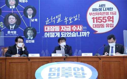 더불어민주당 ‘화천대유 토건비리 진상 TF’ 단장을 맡은 김병욱 의원이 19일 국회에서 열린 TF 2차 회의에서 발언하고 있다. 김종호 기자 kimjh@전날(18일) 국회 행정안전위원회의 경기도청 국감이 ‘조폭 돈뭉치 사진’이라는 국민의힘의 자충수로 얼룩지면서 핵심인 대장동 문제를 비롯한 이재명 경기지사의 여러 의혹에 대한 언급은 별다른 주목을 받지 못했다. 이날 국감의 외양은 일단 달변가인 이재명 경기지사의 ‘완승’으로 평가받았지만, 대장동 의혹 규명이라는 본질에 다가갈 수 있는 주목할 만한 문답도 일부 있었다.