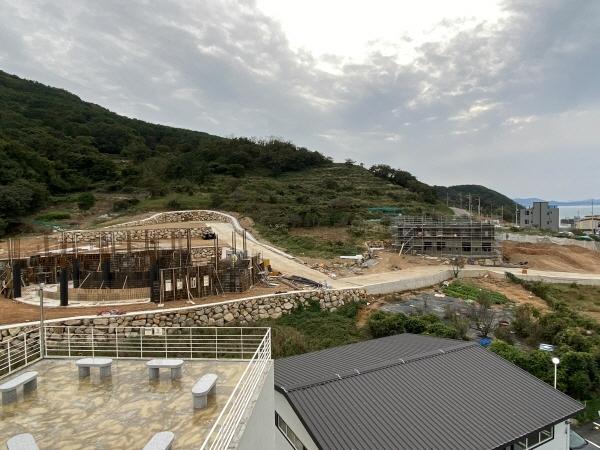 20일 오후 3시 부산 강서구 가덕도 대항항 인근에서 건물 2곳이 신축 중이다. 올 7월 기준 가덕도 신축 건물은 123곳으로 지난해보다 배 넘게 늘었다.“올라가는 건물이 한두 개가 아닙니다. 요새는 온 섬에 ‘깡깡’ 거리는 공사 소리밖에 안 들려요.”