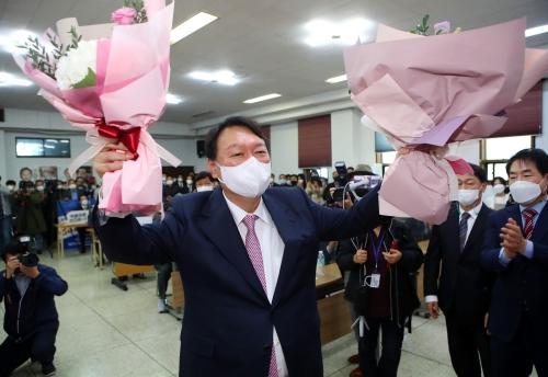 윤석열 전 검찰총장이 20일 국민의힘 대구시당에서 열린 ‘국민캠프 대구 선대위 임명장 수여식’에서 지지자들에게 받은 꽃다발을 들어 올리고 있다. 연합뉴스국민의힘 대선 경선 후보인 윤석열 전 검찰총장은 ‘전두환 옹호 발언’에 대해 20일 대구 방문 중 기자들과 만나 “제가 호남인들을, 화를 내게 하려고 한 이야기가 아니다”며 별도로 유감 입장을 발표하지 않겠다는 의지를 밝혔다. ‘나는 잘못이 없고’ 본말을 왜곡해서 듣는 트집이라는 인식도 거듭 드러냈다.