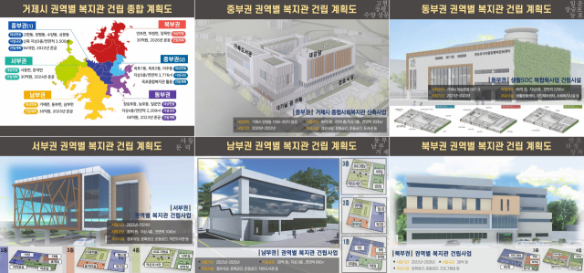 시설은 2026년까지 250억 원을 투입해 연차적으로 건립한다. 우선 중부1에 94억 원을 들여 지하 1층, 지상 3층 연면적 3500㎡ 규모로 2022년 준공한다. 이어 동부 66억 원 2023년(4층, 2200㎡), 서부 30억 원 2024년(4층, 1049㎡), 남부 30억 원 2025년(3층 990㎡), 북부 30억 원 2026년 준공을 목표로 잡았다. 중부2는 기존 옥포종합사회복지관을 활용한다.