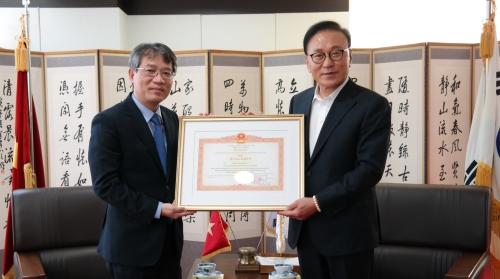 박수관((주)YC-TEC 회장·오른쪽) 베트남 명예총영사가 지난 20일 한국과 베트남의 경제, 문화, 교육 협력과 교류 등 다양한 분야에서 헌신한 공로를 인정받아 팜민찐 베트남 총리 표창장을 받았다.