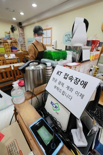 25일 오전 전국 곳곳에서 KT의 유·무선 네트워크 접속 장애가 발생했다. 부산 동구 한 식당에 신용카드 결제 시스템 접속 장애로 현금결제를 당부하는 안내문이 붙어 있다. 김경현 기자 view@25일 점심시간 전후 KT 통신망 장애로 전화와 인터넷 등이 마비되어 전국적으로 한 시간가량 큰 혼란이 빚어졌다. 식당 등 업소들의 결제 시스템이 먹통이 되면서 이용자들이 큰 불편을 겪었고, 주식 거래 피해자도 속출했다. 부산에서는 BRT 공사 구간의 신호체계에 영향을 끼쳐 일대 교통이 한때 마비됐으며, 온라인 강의와 시험을 진행하던 대학에도 항의가 빗발쳤다. 바이러스나 화재로 발생한 이전 사고와 달리 라우터 오류라는 단순 실수로 국가기간통신망이 전국적으로 마비된 초유의 사태에 관리 부실을 우려하는 목소리가 높다.