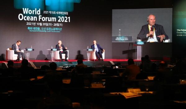 행사에 참석한 박형준 부산시장은 “부산은 그린스마트 도시를 비전으로 삼아 디지털 전환이라는 시대적 흐름에 맞춰 탄소중립을 향한 발걸음을 먼저 내딛고 있다”며 “이번 행사가 해양항만 산업이 나아가야 할 새로운 지혜와 전략을 알려주길 기대한다”고 말했다. 문성혁 해양수산부 장관은 영상을 통해 “기후변화와 코로나19가 거대한 변화의 파도를 일으키고 있다”며 “해양 분야의 다보스 포럼으로 자리매김한 세계해양포럼을 통해 거대한 변화 속에서 인류가 한 걸음 더 밝은 미래로 나갈 수 있는 통찰과 지혜가 모이기를 기원한다”고 전했다.
