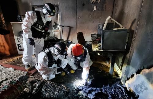27일 부산 강서구 ENK에서 열린 부산소방재난본부 주최 ‘2021년 부산소방 화재감식 경연 대회’에 참가한 소방관들이 화재 정밀 감식을 하고 있다. 이번 행사는 화재현장을 연출하기 위해 원룸형으로 만들어진 컨테이너 내부에 인위적으로 불을 내 현장 감식을 진행했다. 정대현 기자 jhyun@