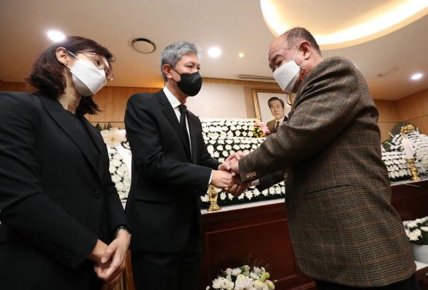 5.18 광주민주화운동 당시 전남도청에서 시민군 상황실장을 맡았던 박남선씨가 27일 서울대병원 장례식장에 마련된 노태우 전 대통령 빈소를 찾아 조문한 뒤 유족인 딸 노소영 아트센터 나비 관장, 아들 노재헌 동아시아문화센터 이사장과 대화하고 있다. 사진공동취재단노태우 전 대통령의 장례가 닷새간의 국가장으로 치러진다.