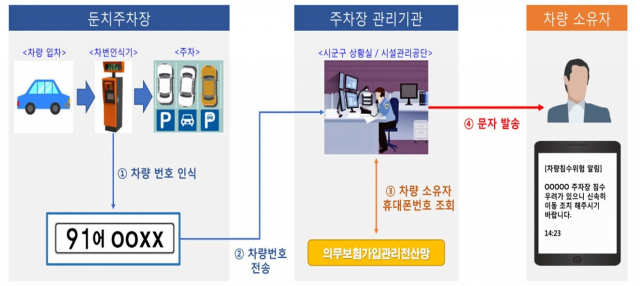 둔치주차장 침수알림시스템은 차량이 둔치주차장으로 진입하면 차량번호를 인식하고 집중호우로 하천 수위가 상승하면 수집된 차량번호를 활용해 차주 연락처로 위험상황을 알리는 시스템이다.