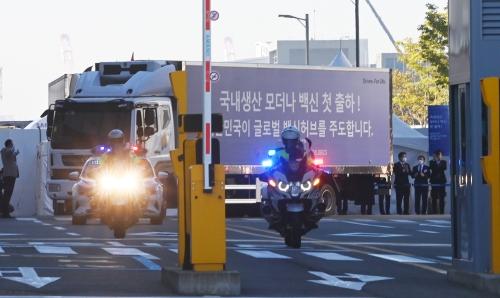 28일 인천 삼성바이오로직스에서 모더나사의 코로나19 백신을 실은 트럭이 빠져나오고 있다. 이 백신은 삼성바이오로직스가 위탁 생산한 초도 물량으로 국내에 처음 공급된다. 사진공동취재단