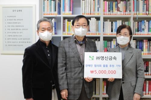 (주)영신금속(대표 배순자)은 4일 (사)부산국제장애인협의회(회장 강충걸)가 운영하는 ‘영혼이 춤추는 도서관’에서 500만 원 상당의 생필품을 기탁했다.