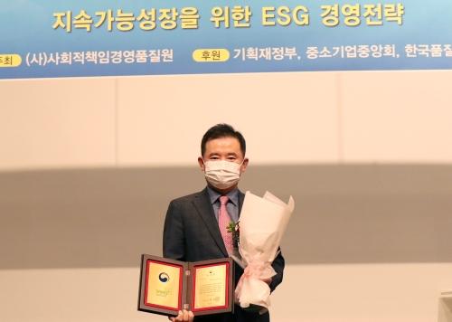 아이에스동서(주)(회장 권혁운)가 지난 3일 (사)사회적책임경영품질원(회장 박성현)이 주최한 ‘사회적책임경영품질 컨벤션 2021’에서 ESG경영대상(부총리겸 기획재정부 장관상)을 받았다.