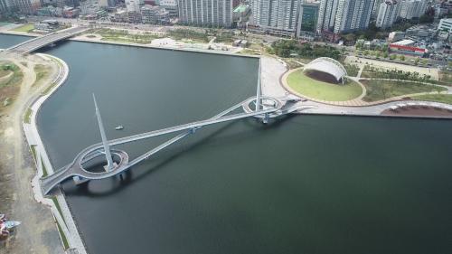 6일부터 시민에게 개방된 8자형 보도교와 서항지구(오른쪽) 친수공간. 왼쪽은 인공섬인 마산해양신도시다. 창원시 제공경남 창원의 새로운 명물이 될 전국 최대 규모의 ‘바다 쉼터’가 시민 품으로 돌아왔다.