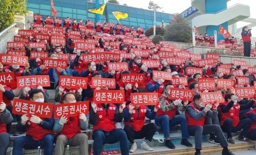 지난 5일 부산항운노조가 부산 중구 부산항만공사 앞에서 신항 서컨테이너부두 2-5단계 무인 운송장비 도입에 반대하는 집회를 갖고 있다. 정대현 기자 jhyun@