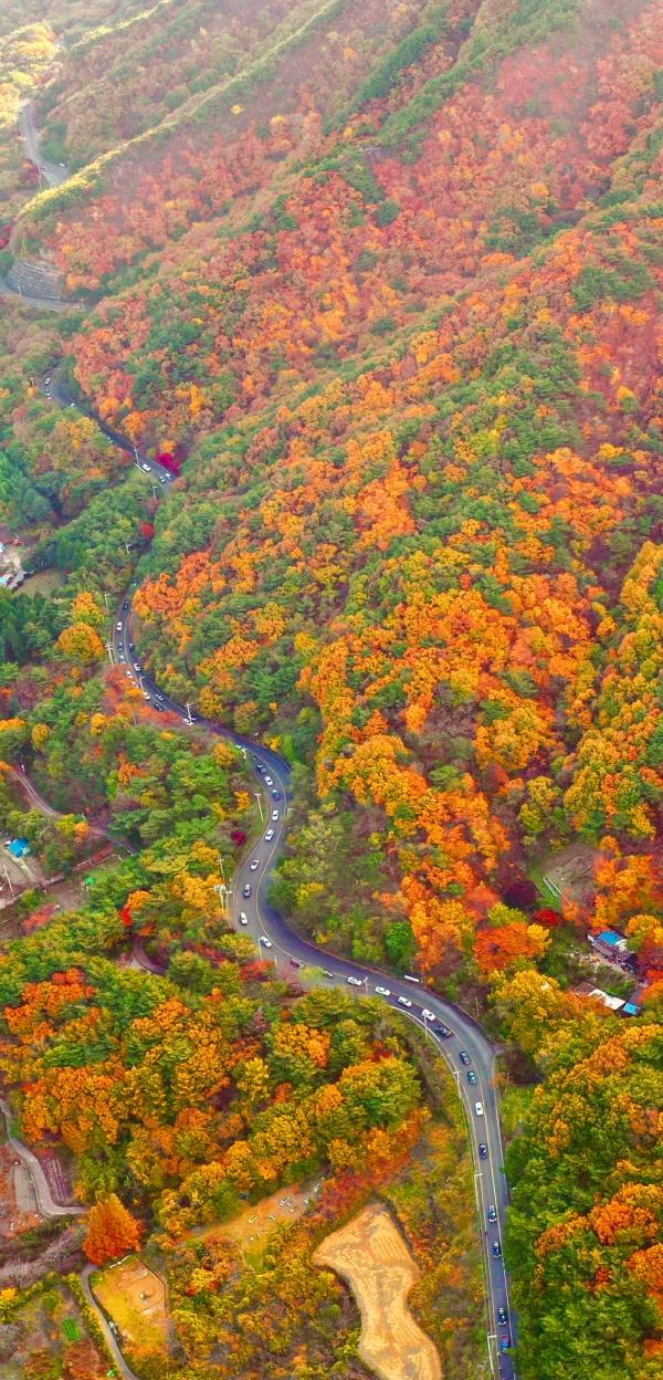 휴일인 7일 오후 단풍으로 물든 울산 울주군 가지산 고갯길로 많은 나들이 차량이 오가고 있다. 이날 전국의 단풍 명소마다 나들이객이 몰리면서 경부고속도로 등 주요 도로가 극심한 정체를 빚었다. 8일 전국에 비가 내린 뒤 기온이 큰 폭으로 떨어질 전망이다. 정종회 기자 jjh@