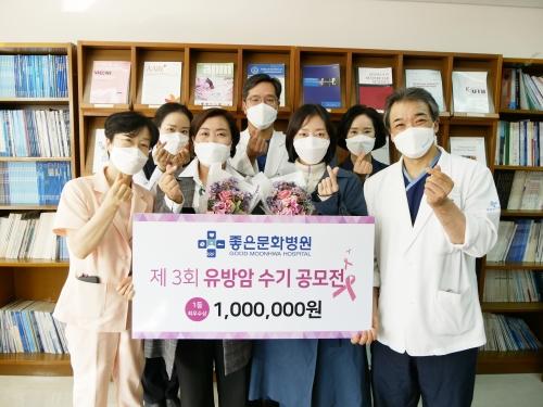 최근 좋은문화병원에서 열린 ‘제3회 유방암 수기 공모전’의 시상식. 좋은문화병원 제공좋은문화병원(병원장 문화숙)이 지난달 28일 병원 의학도서실에서 ‘제3회 유방암 수기 공모전 시상식’을 개최했다. 시상식에는 은성의료재단 구자성 부이사장, 좋은문화병원 유방암센터 유동원 소장, 이양미 간호부장, 김옥순 원무부장과 수상자들이 참석했다.