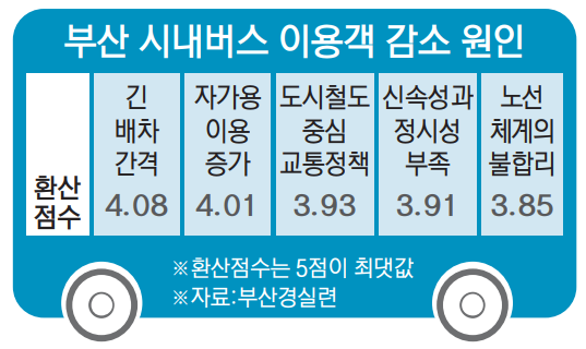 부산시가 BRT(간선급행버스체계)를 비롯한 대중교통 유인 정책을 펼치지만 부산시민 가운데 절반 넘게 시내버스를 이용하지 않는 것으로 나타났다. 자가용 선호는 여전한 반면, 버스 이용은 점점 줄어든다. 긴 배차간격, 정시성 부족, 불합리한 노선 체계 등 시내버스의 고질병 극복이 시급하다.