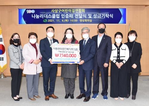 부산 사상구청은 최근 사상구어린이집연합회(회장 임정희)로부터 성금 714만 원을 기탁받았다고 밝혔다. 이를 계기로 사상구어린이집연합회는 부산사회복지공동모금회 ‘나눔리더스클럽’(사상구1호, 부산14호)에 가입하게 됐다. 임정희 회장은 “사상구의 첫 번째 나눔리더스클럽 회원이 되어 책임감이 더욱 크고, 앞으로도 이웃을 위해 나눔을 함께하겠다”고 말했다. 임원철 선임기자