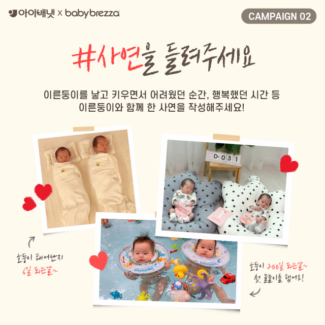 △영유아 식품기업 '아이배냇'과 글로벌 유아용품 브랜드 '베이비브레짜'가 15일부터 26일까지 '#사연을 들려주세요!'를 진행한다. 아이배냇과 베이비브레짜는 17일 '세계 이른둥이의 날'을 기념해 이달 동안 이른둥이와 이른둥이 가족을 응원하는 '내일 응원 캠페인'을 진행 중이다. 이른둥이 사연 공모는 함께 아이 키우는 부모의 마음으로 응원의 마음을 담은 출산 또는 육아 경험담, 이른둥이 육아 경험담, 육아팁 등 이른둥이와 이른둥이 부모에게 공감이 될 수 있는 이야기를 접수하면 된다. 사연을 접수한 사람 가운데 13명은 베이비브레짜 분유 제조기, 베이비브레짜 할인쿠폰과 아이배냇의 분유 세트, 아이배냇과 웜리의 제품들로 구성된 이른둥이 박스 중 하나를 받을 수 있다.