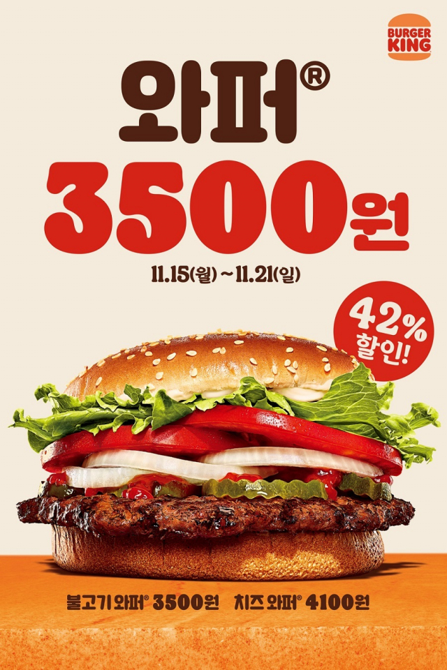 △프리미엄 햄버거 브랜드 버거킹이 21일까지 대표 메뉴인 '와퍼'와 '불고기와퍼'를 42% 할인된 3500원에 판매하는 프로모션을 실시한다. 와퍼는 직화 방식으로 조리된 100% 순 쇠고기 패티의 담백함과 깊은 풍미를 느낄 수 있는 버거킹의 대표 메뉴다. 달콤한 버거킹 고유의 불고기 소스가 추가된 불고기와퍼 역시 한국적인 맛을 살려 꾸준한 사랑을 받고 있다. 프로모션을 통해 두 메뉴 외에도 고소한 치즈가 추가된 치즈와퍼 역시 4100원에 즐길 수 있다. 딜리버리와 일부 매장을 제외한 전국 버거킹 매장에서 진행되며, 1인당 최대 5개까지 구매할 수 있다. 다른 할인·쿠폰과 중복 혜택 적용은 불가능하다.