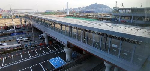 부산역과 부산항국제여객터미널을 잇는 보행덱(사진)과 공중보행교(아래 작은 조감도) 사이를 연결할 북항 환승센터가 최근 부산시의 건축심의를 통과했다. 강선배 기자 ksun@·부산항만공사 제공부산역과 부산항국제여객터미널을 잇는 보행덱을 연결할 북항 환승센터가 최근 건축심의를 통과했다.
