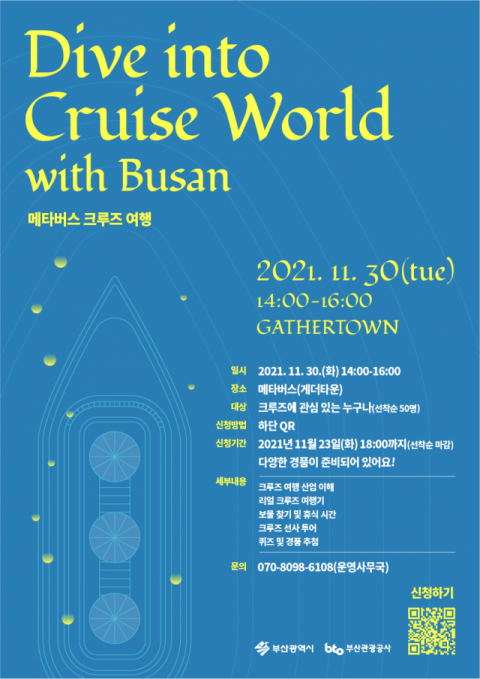 부산광역시(이하 부산시)와 부산관광공사(이하 공사)는 위드 코로나 시대에 본격적인 크루즈 여행 홍보를 위한 온라인 프로그램 ‘Dive into Cruise World with Busan’을 추진한다.