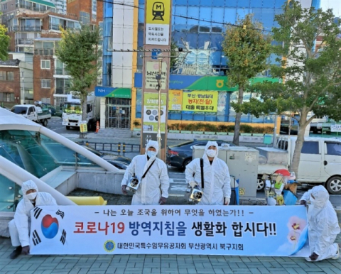 부산 북구(구청장 정명희)는 지난 11월 13일 대한민국 특수임무유공자회 북구지회(회장 최주식)가 코로나19 확산을 예방하고 건강한 북구를 조성하기 위해 남산정 지하철역 일원에 방역 소독을 실시했다고 밝혔다.