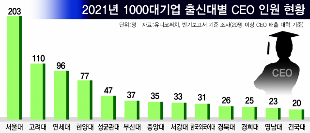한편 서울대, 고려대, 연세대 출신 재계 CEO 비율은 지난해보다 줄어든 것으로 나타났다. 이들 3개 대학의 CEO가 전체의 28.4%(409명)에 달했지만 이는 지난해 29.3%보다 0.9%포인트(P) 낮아진 것이다. 이들 대학 출신 CEO 비율은 꾸준히 줄어드는 추세로, 10년 전인 2011년(41.7%)과 비교하면 13.3%P 낮아졌다. 그간 서울대 출신 CEO가 고려대·연세대 출신 CEO를 합친 것보다 더 많았지만, 올해 처음으로 역전됐다고 유니코써치는 설명했다. 학부 전공별로는 경영학과 출신이 22.3%로 가장 많았다. 그 뒤로 기계학과(7.4%), 경제학과(7.3%), 화학공학과(6.5%), 전자공학과(6.2%), 법학과(3.8%) 순이었다.