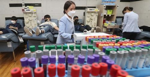코로나19 장기화로 혈액 수급에 차질이 빚어지고 있다. 22일 부산 부산진구 동의대 헌혈의 집에서 열린 ‘제42회 동의 가족 이웃사랑 헌혈 릴레이‘ 행사에서 대학생들이 헌혈을 하고 있다. 강선배 기자 ksun@코로나19 확산세가 커지고 위중증 환자가 늘면서, 전국의 코로나19 주간 위험도가 1주 만에 ‘높음’으로 격상됐다.
