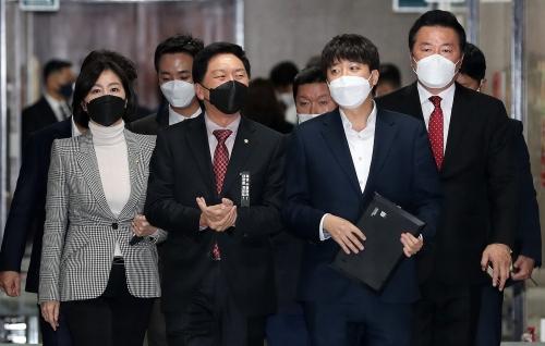 국민의힘 이준석(오른쪽 두 번째) 대표와 김기현(오른쪽 세 번째) 원내대표가 22일 국회에서 열린 최고위원회의에 참석하고 있다. 김종호 기자 kimjh@정치권이 또 한번 ‘페미니즘 논쟁’으로 들썩이고 있다. 논쟁의 주인공은 ‘이대남’(20대 남성)의 열렬한 지지를 받는 국민의힘 이준석 대표와 이 대표의 ‘안티 페미니즘’ 정치를 정면으로 비판해 온 진중권 전 동양대 교수. 올 5월 이 대표가 당 대표 공약으로 내세운 ‘여성 할당제’ 폐지를 놓고 격렬하게 부딪친 두 사람은 최근 서울에서 일어난 30대 여성의 데이트 폭력 피살 사건을 두고 또 한번 충돌한 것이다.