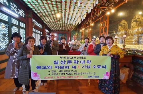 부산불교문인협회(회장 차정연)는 최근 부산 감로사에서 실상문학대학 ‘불교와 차문화’(지도교수 양은순) 1기생 강의 수료식을 가졌다.