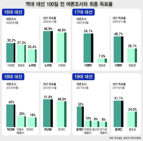 여론조사가 선거 지표로 활용되기 시작한 14대 대선부터 지난 19대 대선까지 여론조사 추이를 분석해보면 6번의 대선 중 5번은 ‘D-100일’을 전후한 여론조사에서 1위를 달린 후보가 대선에서 최종 승리를 거머쥔 것으로 나타났다.