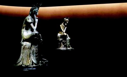 그런데 이번엔 왜 남다르게 느껴진 것일까. ‘사유의 방’ 덕분이다. 국립중앙박물관 상설전시실 2층에 들어선 사유의 방은 오로지 두 반가사유상만을 위한 공간이다. ‘두루 헤아리며, 깊은 생각에 잠기는 시간’ 글귀를 지나자 사방이 캄캄하다. 어둠에 적응하면서 모퉁이를 도는 순간, ‘아!’ 하는 탄성이 나왔다. 소극장 크기만 한 공간에 타원형 무대가 있고, 그 위에서 반가사유상 두 점이 미소 짓고 있다. 수많은 빛으로 몽환적 느낌을 주는 천장 분위기까지 더해지면서 반가사유상의 에너지와 공간은 거의 일체가 된 듯했다.