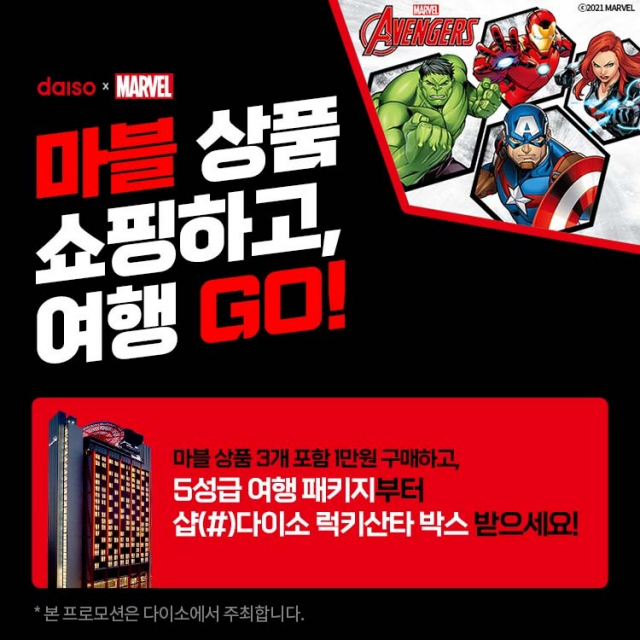 △균일가 생활용품점 아성다이소가 운영하는 매장 기반 배송 서비스인 샵(#)다이소에서 '마블 상품 쇼핑하고, 여행 GO!'를 진행한다. 12월 한 달 동안 주 단위로 다이소 매장과 샵다이소에서 진행하며, 응모방법은 '마블 시리즈 상품' 3개 포함 총 1만 원 이상 구매하고 다이소멤버십을 적립하면 된다. 단, 동시 응모는 가능하지 않고 매장과 샵다이소 합산금액이 아닌 개별 금액으로 적용된다. 매주 '마블 시리즈 상품' 최대 구매자에게 '페어몬트 앰배서더 서울' 여행 패키지, 추첨을 통해 '인터컨티넨탈 서울 코엑스' 여행 패키지와 '샵다이소 럭키 산타박스'를 증정한다. 5만 원 초과 경품에 대한 제세공과금(22%)는 본인부담이다.