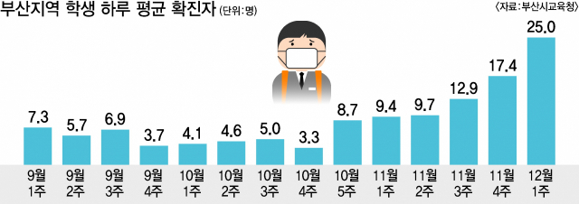 2학기 개학 초와 비교하면 학생 확진자 증가 추세는 가파르다. 9월 첫째 주 하루 평균 7.3명이 확진되다, 10월 넷째 주 3.3명까지 떨어졌지만, 이후 가파르게 상승해 이달 첫 주엔 25.0명까지 치솟았다. 9월 초에 비하면 4배, 가장 적을 때와 비교하면 8배 가까이 폭증한 수치다.