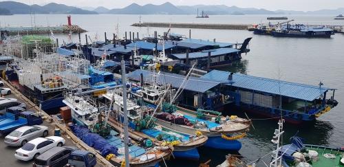 8일 오후 경남 통영시 동호항에 멸치 어가 폭락과 어획난으로 항구에 발이 묶인 어선들이 줄지어 정박해 있다. 파란색 지붕을 얹은 선박들이 멸치잡이 권현망선단이다.“나가봤자 빈손일 텐데, 기름값이라도 아껴야죠.”