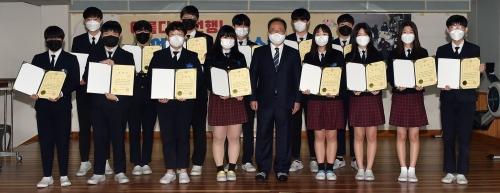 김석준 부산시교육감은 13일 부산 수영구 망미중학교를 방문해 선행 학생 14명에게 교육감 표창장을 수여하고 학생들을 격려했다. 부산시교육청 제공홀로 폐지를 줍는 할머니를 도와 훈훈한 감동을 줬던 부산의 한 중학교 학생들이 부산시교육감 표창을 받았다.