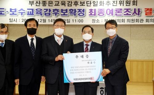 하윤수(오른쪽 두번째) 전 부산교대 총장이 14일 부산시의회 의원회관 회의실에서 열린 부산좋은교육감후보추진위의 중도·보수교육감후보 최종 여론조사 결과 후보로 확정돼 추대증을 받고 있다. 정종회 기자 jjh@내년 6월 부산시교육감 선거를 앞두고 보수교육계인 ‘부산좋은교육감후보단일화추진위원회’(부추위) 최종 후보로 하윤수 전 부산교대 총장이 14일 확정됐다. 그러나 부추위에 참여하지 않은 보수진영 후보군이 여럿이어서 ‘절반의 단일화’란 평가가 나온다. 김석준 현 교육감이 일찌감치 3선 도전 의지를 굳힌 가운데 범진보 진영에서도 추가 후보가 나올 가능성이 있어 어느 때보다 양 진영의 단일화 여부가 당락의 관건이 될 전망이다.