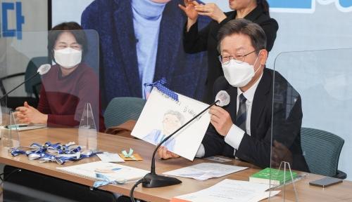 더불어민주당 이재명 대선후보가 20일 서울 여의도 중앙당사에서 열린 ‘국가가 함께 키우겠습니다’ 전국민 선대위 회의에서 선물로 받은 그림을 들어보이고 있다. 국회사진기자단더불어민주당 이재명 대선후보가 부동산 정책 ‘우향우’에 연일 속도를 낸다. 공시지가 현실화 속도 조절, 다주택자 거래세 완화, 보유세 중과 유예 등 문재인 정부 부동산 정책의 근간을 흔드는 수준이다. ‘한시적’ ‘1가구 1주택’ 등 꼬리표를 달긴 했지만 이 후보가 강경하게 천명한 부동산 증세 기조와 정면 배치된다는 점에서 말 뒤집기 비판이 거세다.