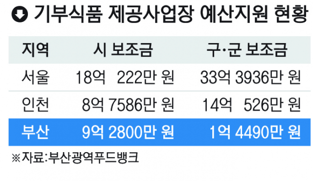 실제 지난해 전국의 기부식품 등 제공사업장 예산지원현황을 보면 부산의 경우 구·군이 지원한 금액은 1억 4490만 원에 불과하다. 전국 15개 시·도 가운데 세종과 제주를 제외하면 가장 적은 규모다. 시 부담금은 전국적으로 높은 수준이지만, 시와 구·군의 불균형이 심각하다. 부산의 구·군 보조금은 서울(33억 3900만 원)의 4% 수준이며 인천(14억 원)의 10%에 불과하다.