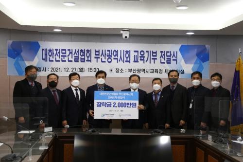 대한전문건설협회 부산시회(회장 김세원·왼쪽 네 번째)는 27일 부산시교육청에서 김석준(왼쪽 다섯 번째) 부산시교육감에게 저소득층 학생을 위한 교육기부금 2000만 원을 전달했다.